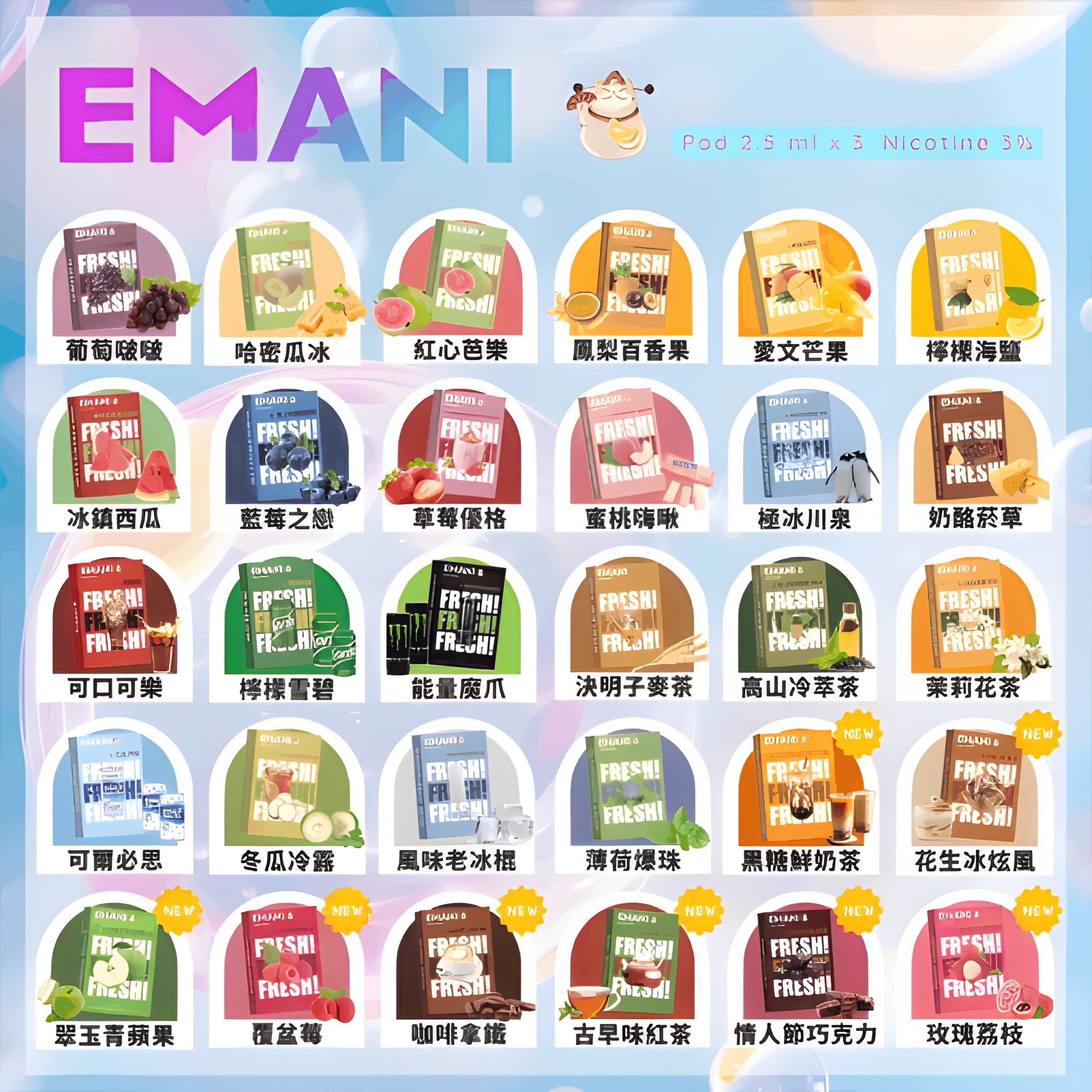 Emani 菸彈以其創新設計、豐富口味與強大兼容性,在全球電子煙市場中脫穎而出。是你日常替換煙彈的理想選擇。